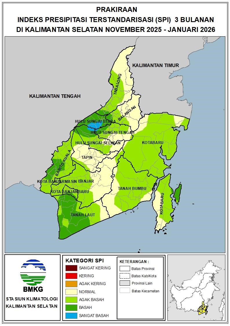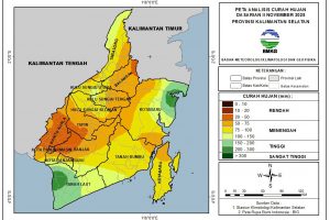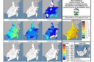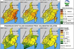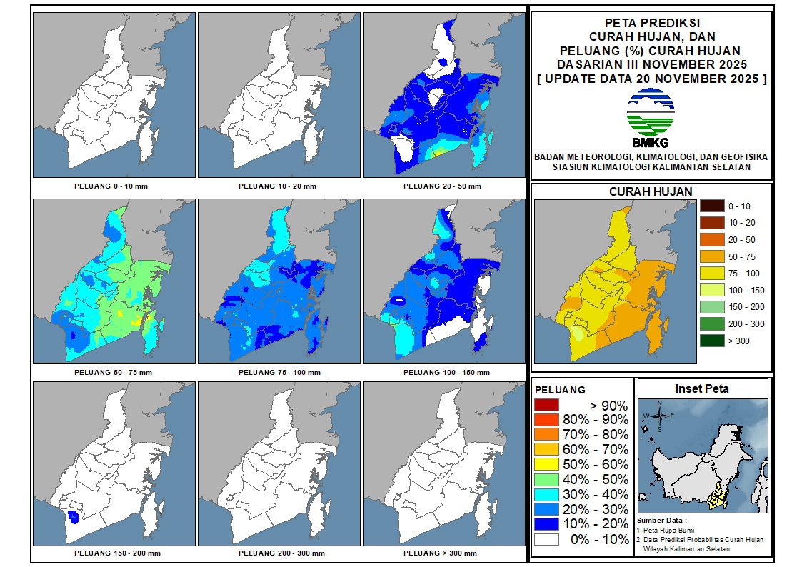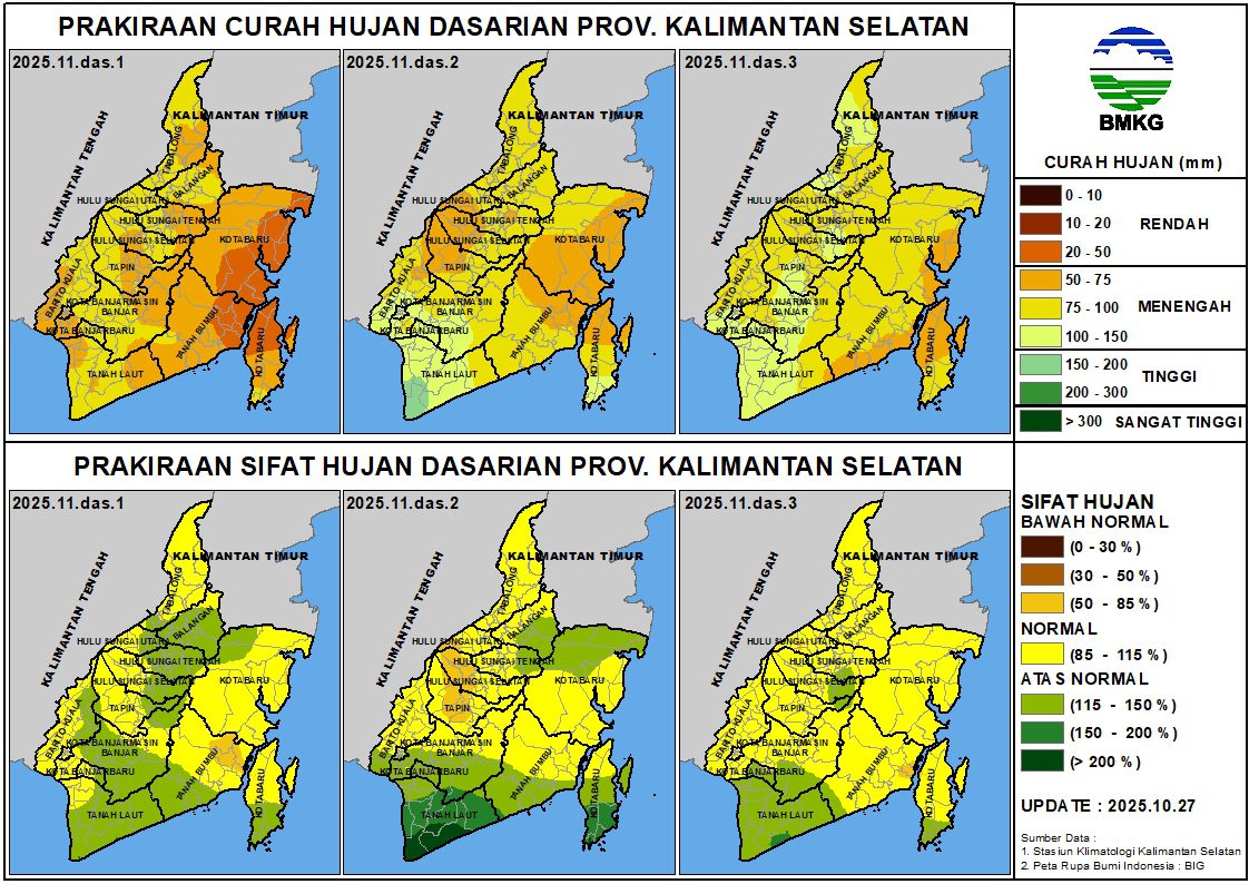 Badan Meteorologi, Klimatologi, dan Geofisika (BMKG) Stasiun Klimatologi Kalimantan Selatan merilis hasil Prediksi Curah Hujan dan Peluang (%) Curah Hujan Dasarian I November 2025