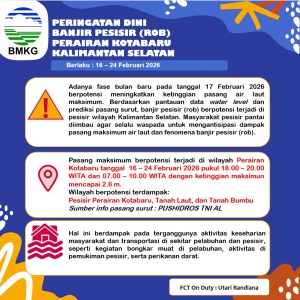 Badan Meteorologi, Klimatologi, dan Geofisika (BMKG) Stasiun Meteorologi Syamsudin Noor memprakirakan kondisi cuaca di wilayah Kalimantan Selatan dalam sepekan ke depan, periode 11โ17 Februari