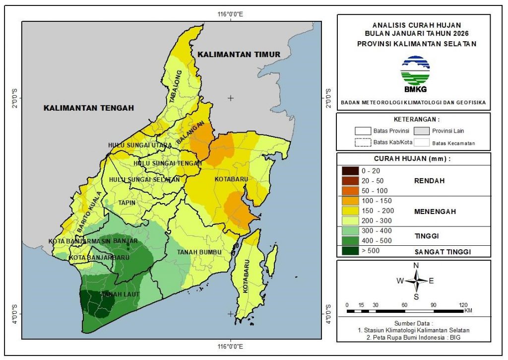 Pada bulan Januari 2026, umumnya curah hujan di Kalimantan Selatan pada kategori Menengah sejumlah 74.5%, dan sisanya mengalami curah hujan kategori Tinggi sejumlah 23.2%, dan kategori Sangat Tinggi sejumlah 2.3%.