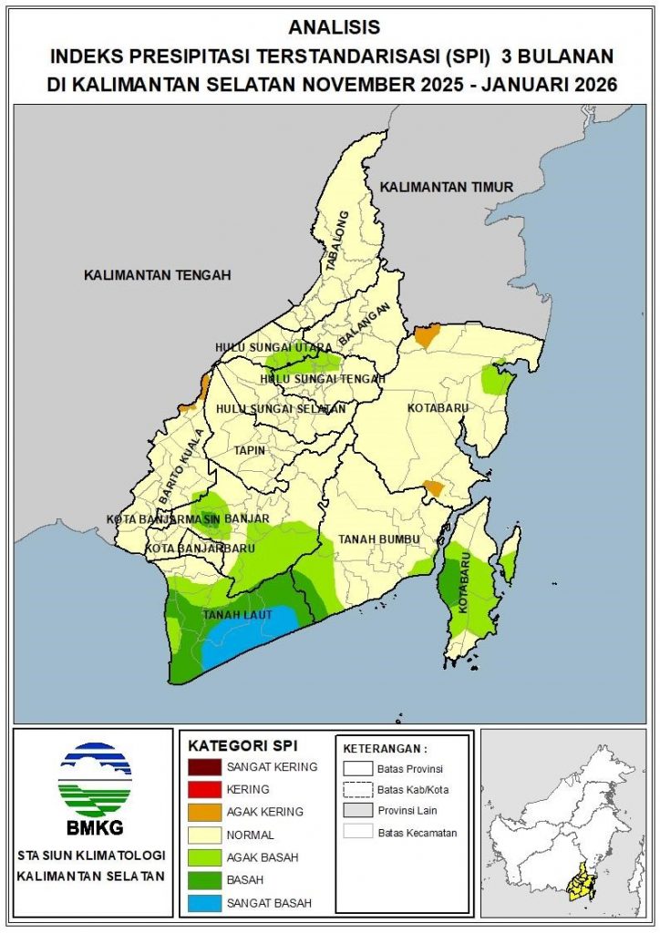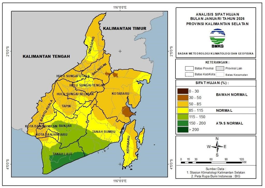 Pada bulan Januari 2026, umumnya sifat hujan di Kalimantan Selatan lebih kering daripada normalnya (Bawah Normal atau BN) yaitu sejumlah 52.7%, sama dengan normalnya (Normal atau N) sejumlah 27.9%, dan lebih basah daripada normalnya (Atas Normal atau AN) sejumlah 19.3%.