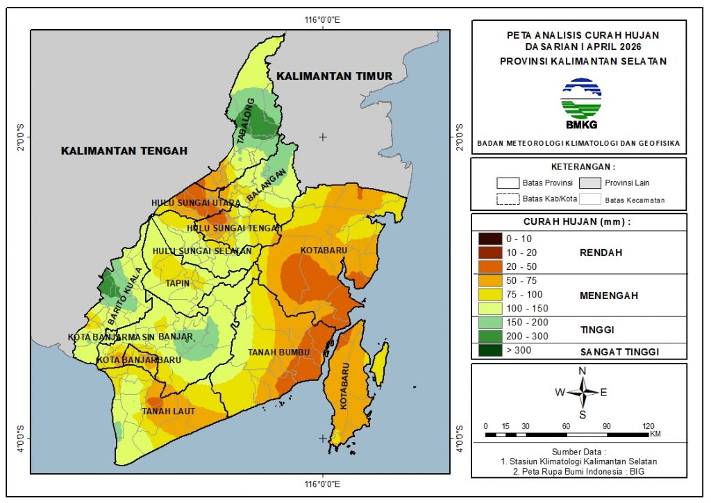 Pada Dasarian I April 2026, sebagian besar wilayah Kalimantan Selatan berada dengan kategori Menengah, yaitu mencakup 80.1% wilayah. Selain itu, sekitar 10.1% wilayah mengalami curah hujan kategori Rendah, dan 9.8% wilayah mengalami curah hujan kategori Tinggi.