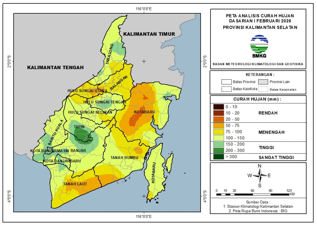 Pada Dasarian I Februari 2026, sebagian besar wilayah Kalimantan Selatan mengalami curah hujan dengan kategori Menengah, yaitu mencakup sekitar 87.3% wilayah. Selain itu, sekitar 11.5% wilayah mengalami curah hujan kategori Tinggi dan sekitar 1.2% wilayah mengalami curah hujan kategori Rendah