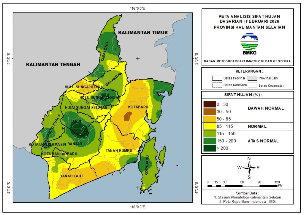 Pada Dasarian I Februari 2026, sebagian besar wilayah Kalimantan Selatan berada kondisi Atas Normal (AN), yaitu mencakup sekitar 53.4% wilayah. Selain itu, sekitar 25.5% wilayah berada pada kondisi Normal (N) dan 21.1% wilayah pada kondisi Bawah Normal (BN).