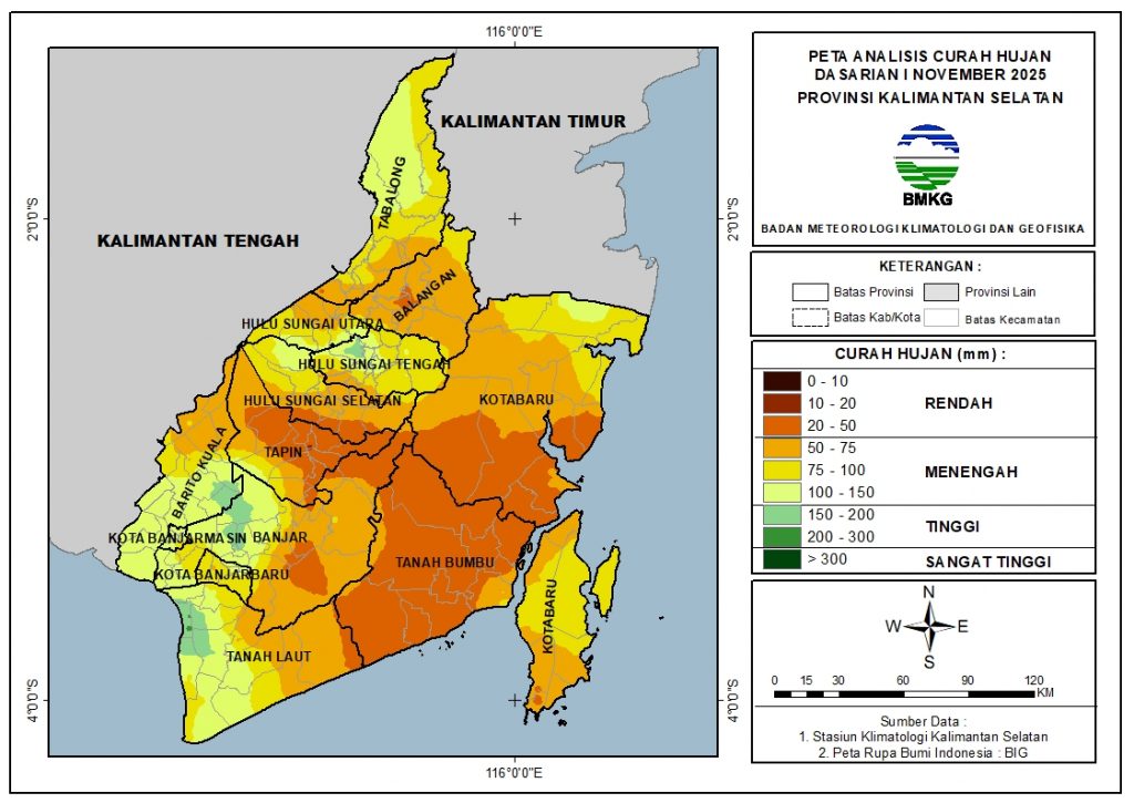 Pada Dasarian I November 2025 (periode tanggal 1–10 November), sebagian besar wilayah Kalimantan Selatan mengalami curah hujan dengan kategori Menengah, yaitu mencakup sekitar 71.5% wilayah. Selain itu, sekitar 26.4% wilayah mengalami curah hujan kategori Rendah, 2.1% mengalami curah hujan kategori Tinggi.