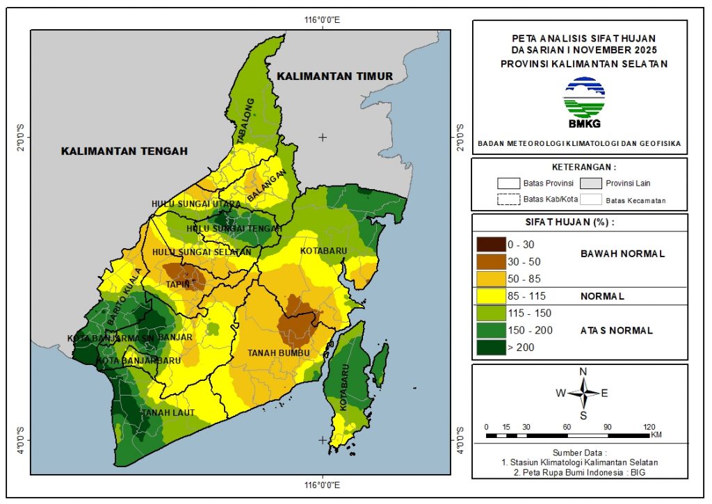 Pada Dasarian I November 2025 (periode tanggal 1–10 November), sebagian besar wilayah Kalimantan Selatan berada kondisi Atas Normal (AN), yaitu mencakup sekitar 47.7% wilayah. Selain itu, sekitar 26.4% wilayah berada pada kondisi Bawah Normal (BN) dan 25.9% wilayah pada kondisi Normal (N).