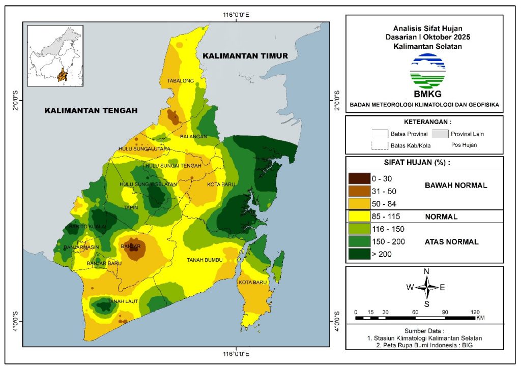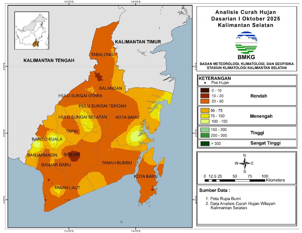 Untuk analisis curah hujan, secara umum wilayah Kalimantan Selatan pada Dasarian I Oktober 2025 berada pada kriteria Rendah hingga Menengah.