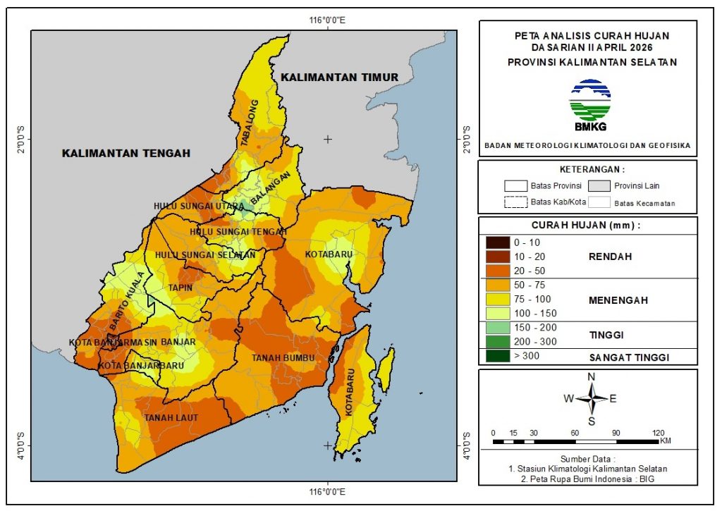 Pada Dasarian II April 2026, sebagian besar wilayah Kalimantan Selatan berada dengan kategori Menengah, yaitu mencakup 74.8% wilayah . Selain itu, sekitar 24.8% wilayah mengalami curah hujan kategori Rendah dan 0.4% wilayah mengalami curah hujan kategori Tinggi.