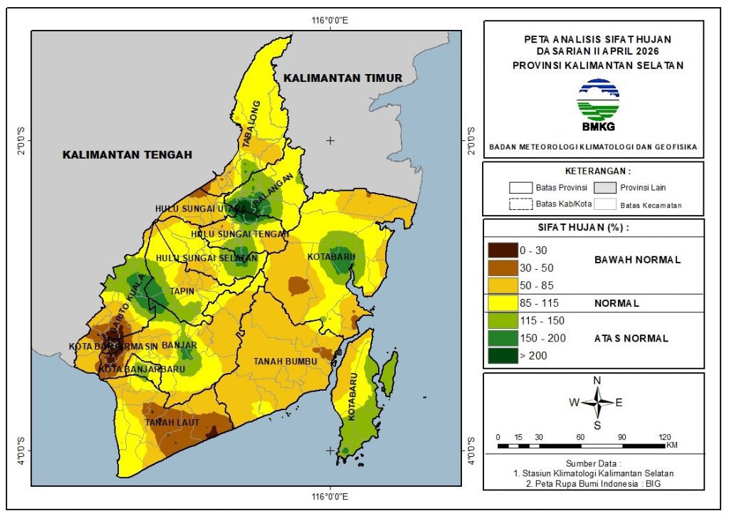 Pada Dasarian II April 2026, sebagian besar wilayah Kalimantan Selatan berada pada kondisi Bawah Normal (BN) yaitu mencakup sekitar 47.8% wilayah. Selain itu, sekitar 33.5% wilayah berada pada kondisi Normal (N) dan 18.7% wilayah pada kondisi Atas Normal (AN).