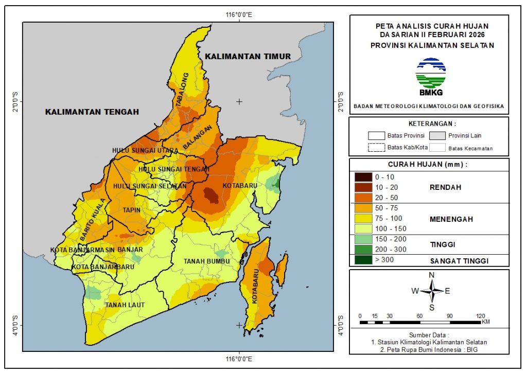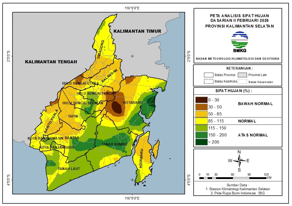 Pada Dasarian II Februari 2026, sebagian besar wilayah Kalimantan Selatan berada kondisi Atas Normal (AN), yaitu mencakup sekitar 36.8% wilayah. Selain itu, sekitar 33.7% wilayah berada pada kondisi Bawah Normal (BN) dan 29.5% wilayah pada kondisi Normal (N).