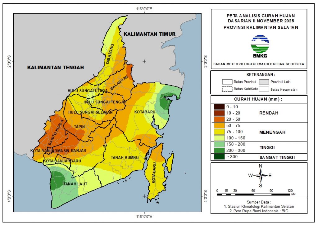 Pada Dasarian II November 2025, sebagian besar wilayah Kalimantan Selatan berada kondisi Atas Normal (AN), yaitu mencakup sekitar 41.5% wilayah. Selain itu, sekitar 34.4% wilayah berada pada kondisi Normal (N) dan 24.1% wilayah pada kondisi Bawah Normal (BN).