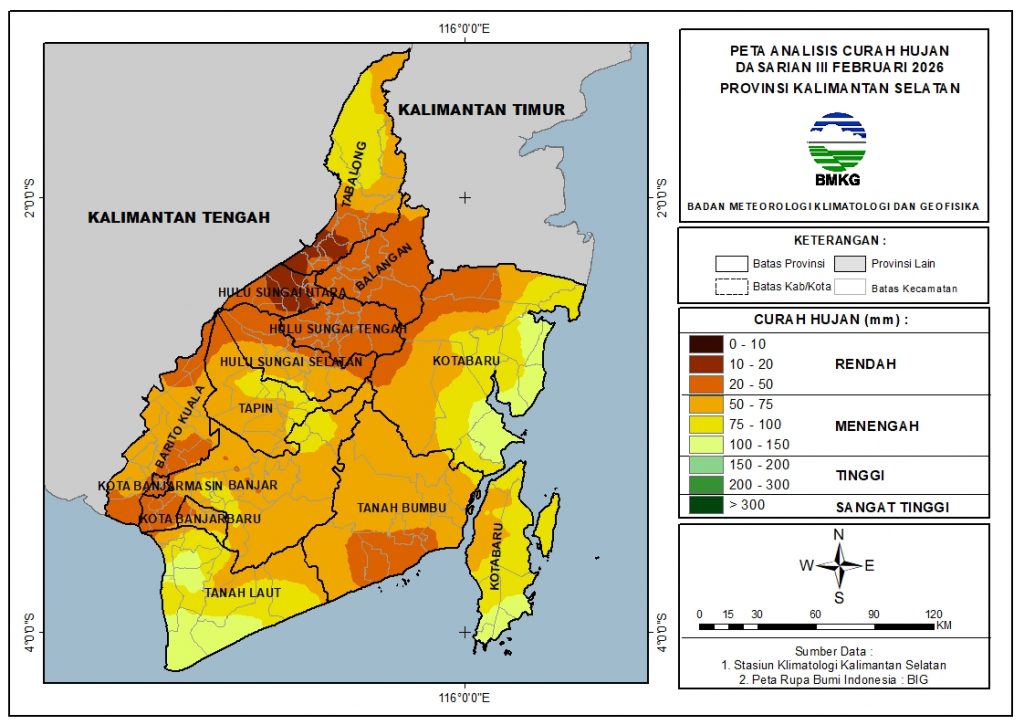 Pada Dasarian III Februari 2026, sebagian besar wilayah Kalimantan Selatan berada kondisi Bawah Normal (BN), yaitu mencakup sekitar 49.8% wilayah. Selain itu, sekitar 25.4% wilayah pada kondisi Normal (N) dan 24.8% wilayah berada pada kondisi Atas Normal (AN).