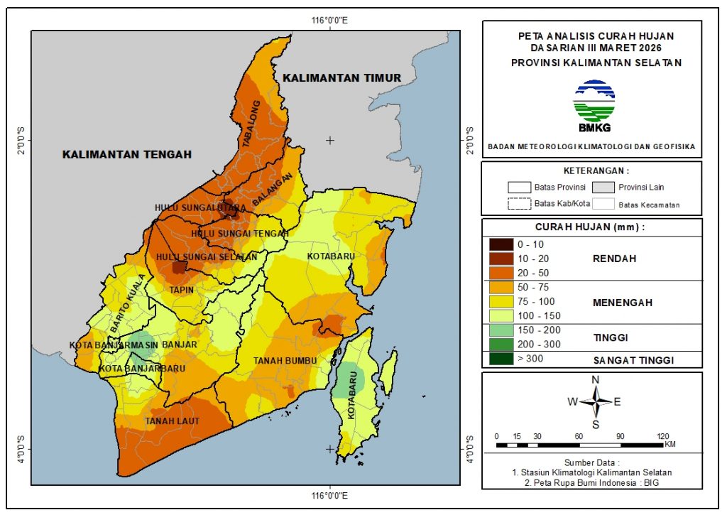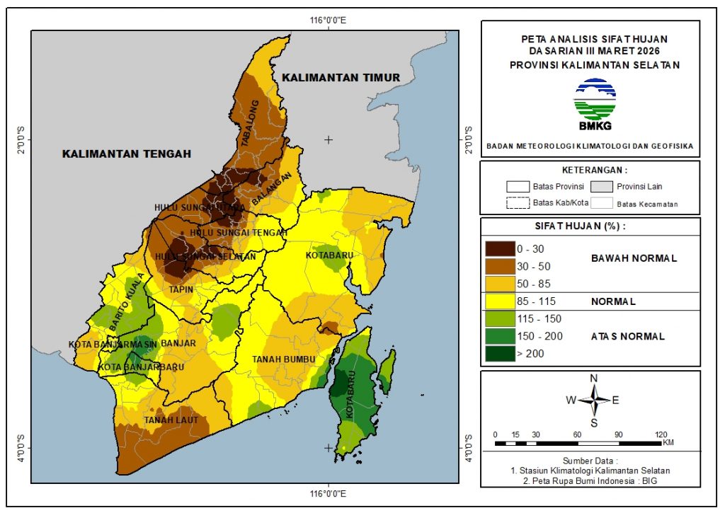 Pada Dasarian III Maret 2026, sebagian besar wilayah Kalimantan Selatan berada pada kondisi Bawah Normal (BN), yaitu mencakup sekitar 54.6% wilayah. Selain itu, sekitar 29.9% wilayah berada pada kondisi Normal (N) dan 15.5% wilayah pada kondisi Atas Normal (AN).