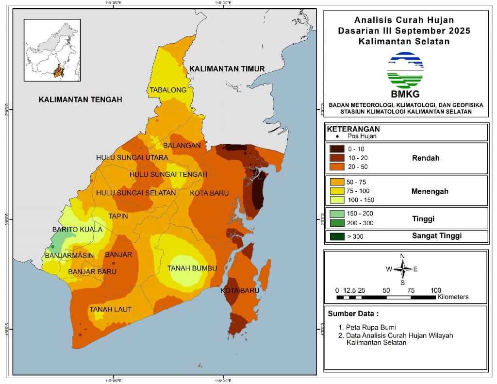 Untuk analisis curah hujan, secara umum wilayah Kalimantan Selatan pada Dasarian III September 2025 berada pada kriteria Rendah hingga Menengah. Selain itu, terdapat juga daerah yang berada pada kriteria Tinggi. Wilayah yang dominan kriteria Tinggi yaitu Kab. Barito Kuala bagian Barat.