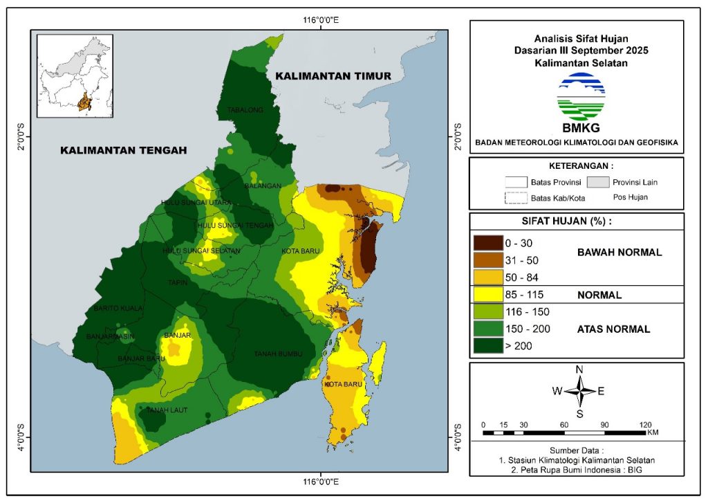 Untuk analisis sifat hujan pada Dasarian III September 2025 secara umum wilayah Kalimantan Selatan berada pada kriteria Atas Normal (AN). Namun terdapat juga wilayah yang berada pada kriteria Normal (N) dan Bawah Normal (BN).