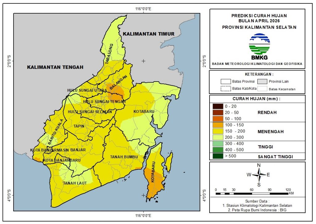 Curah hujan bulan April 2026, di seluruh Kalimantan Selatan diprediksi kategori Menengah yaitu sejumlah 100%.