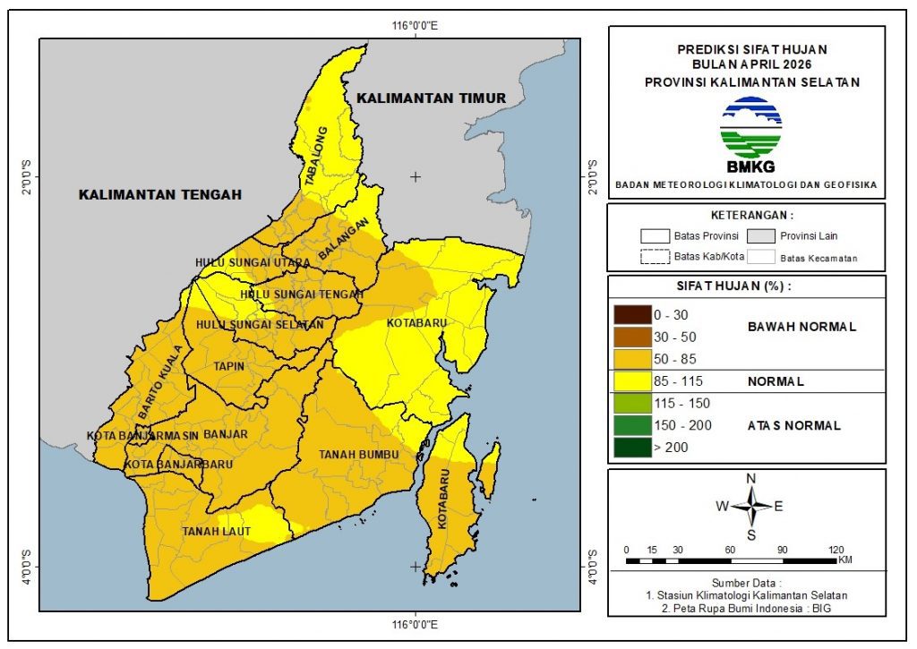 Sifat hujan bulan April 2026, umumnya curah hujan di Kalimantan Selatan diprediksi lebih kering daripada normalnya (Bawah Normal atau BN) sejumlah 68.4% dan sama dengan normalnya (Normal atau N) yaitu sejumlah 31.6%.