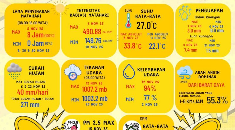 AnalisisIklim Mikro Tue, 16 December 2025 Irul Informasi Iklim Mikro November 2025 Informasi iklim mikro bulan November 2025 di Stasiun Klimatologi Kalimantan Selatan, yaitu : Read More