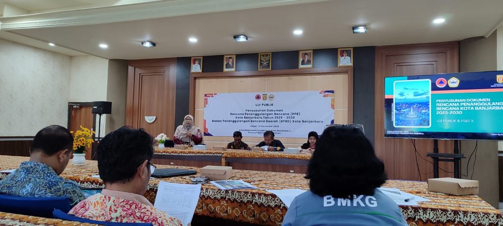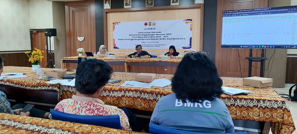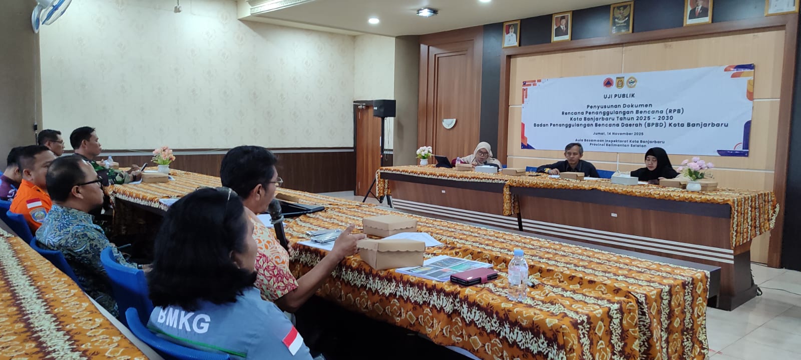jum’at (14/11/2025) Kepala Stasiun Klimatologi Kalimantan Selatan Klaus Johannes Apoh Damanik, S.T., M.P. didampingi Ota Welly Jenni Thalo, M.Si kepala Stasiun Meteorologi Syamsudin Noor dan Sri Widyastuti, S.T. staf Pokja Pengelolaan Data dan Informasi menghadiri undangan Focus Group Discussion (FGD) ke-III Ekspose Akhir Penyusunan Dokumen Rencana Penanggulangan Bencana (RPB) Kota Banjarbaru Tahun 2025 – 2029. Sehubungan dengan Penyusunan dokumen Rencana Penanggulangan Bencana (RPB) Kota Banjarbaru Tahun 2025 – 2029, Badan Penanggulangan Bencana Daerah (BPBD) Kota Banjarbaru melaksanakan Ekspose Akhir dan Focus Group Discussion (FGD) yang ke-III, untuk FGD YANG ke-1 dan ke-2 telah dilaksanakan. Kegiatan ini dilaksanakan bertempat di Aula Basamaan Inspektorat Kota Banjarbaru Jl. Trikora. Pada kegiatan FGD KE-III tersebut dari BMKG banyak memberikan masukan- masukan, saran dan usulan untuk dimasukkan dalam RPB Kota Banjarbaru. Pada akhir penyusunan RPB Kota Banjarbaru ini bapak Sugiyono, selaku Plt Kepala BNPB Kota Banjarbaru, bermanfaat dapat mencegah dan menanggulangi 5 Bencana yang ada dikota Banjarbaru, yaitu Banjir, Karhutla, Cuaca Ekstrem, Tanah Longsor dan Kekeringan, yang mana RPB ini berlaku 2025 – 2030.