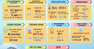 - Lama penyinaran matahari (08.00 – 16.00 WITA), yaitu lama penyinaran maksimum pada 16 Juni 2025 sebesar 7.0 jam (88%) dan minimum pada 2 Juni 2025 sebesar 0 jam (0%).