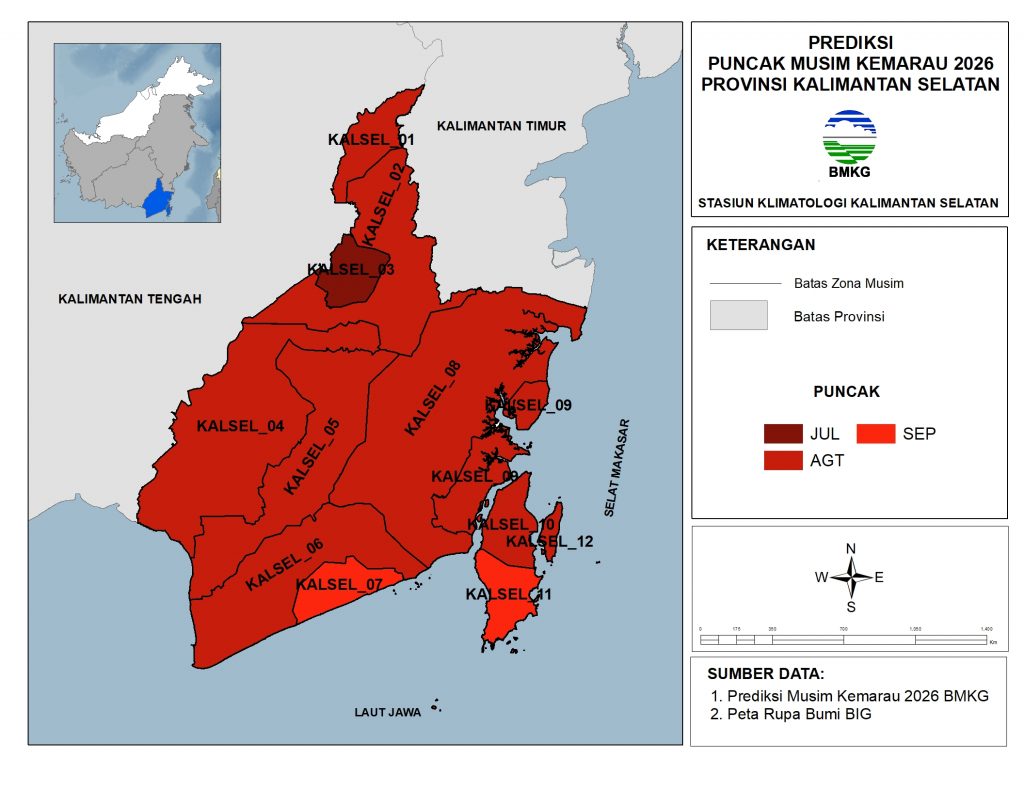 Prediksi Puncak Musim Kemarau tahun 2026 umumnya bulan Agustus (91.5%), bulan September (5.9%), dan bulan Juli (2.6%) dari wilayah Kalimantan Selatan.