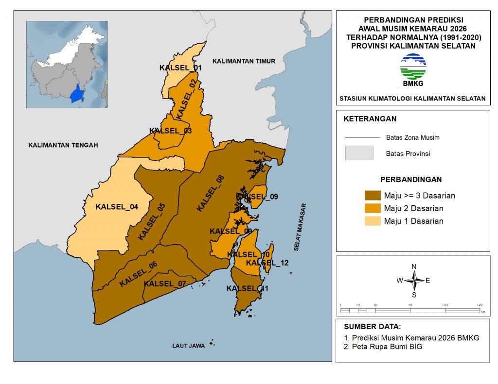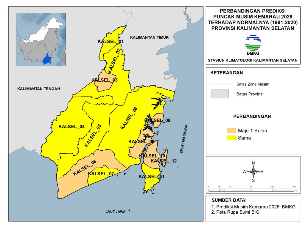 Perbandingan prediksi Puncak Musim Kemarau 2026 Kalimantan Selatan terhadap Normalnya (1991-2020) umumnya sama (77.3%) dan maju 1 bulan (22.7%) dari wilayah Kalimantan Selatan .