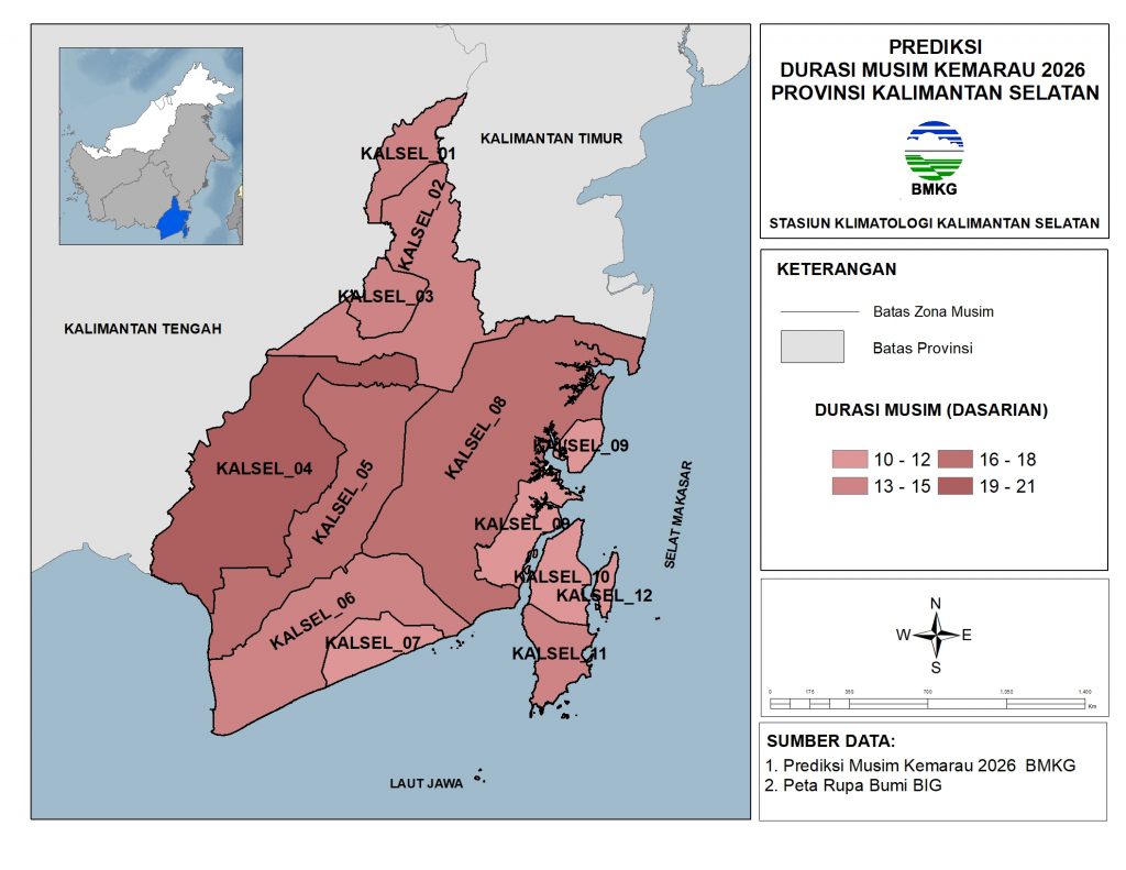 Prediksi Durasi Musim Kemarau 2026 Kalimantan Selatan umumnya 16 – 18 dasarian (38.0%), 13 – 15 dasarian (32.5%), 19 – 21 dasarian (18.5%) dan 10 – 12 dasarian (11.0%) dari wilayah Kalimantan Selatan.