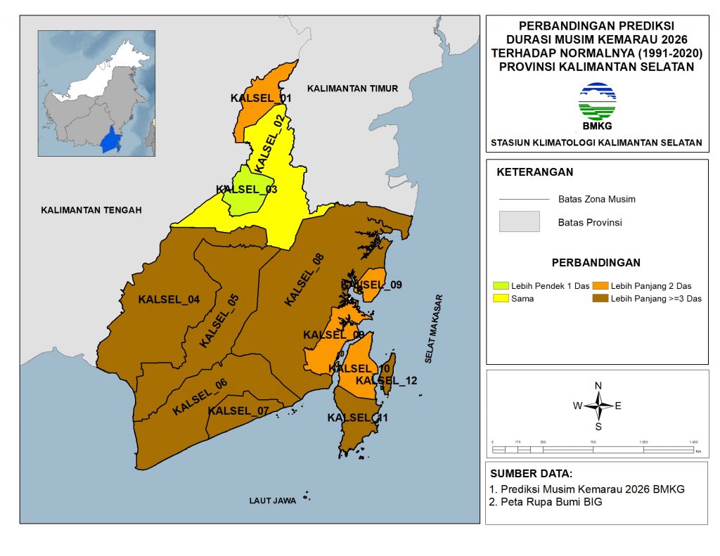 Perbandingan prediksi durasi Musim Kemarau 2026 Kalimantan Selatan terhadap Normalnya (1991-2020) umumnya lebih panjang (85.6%), sama (11.8%) dan lebih pendek (2.6%) dari wilayah Kalimantan Selatan.