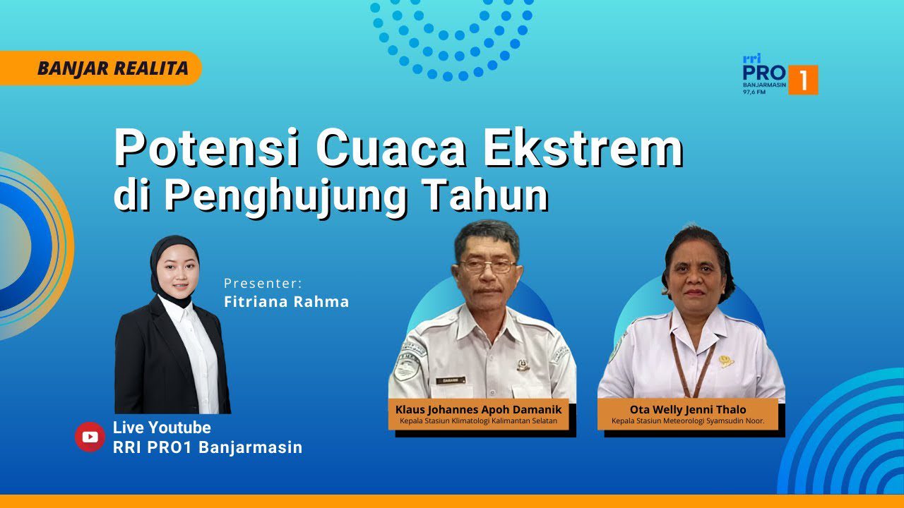 Kamis (11/12/2025) BMKG Kalimantan Selatan, melalui Kepala Stasiun Klimatologi Kalimantan Selatan, Klaus Johannes Apoh Damanik, M.P. dan Kepala Stasiun Meteorologi Syamsudin Noor Ota Welly Jenni Thalo, M.Si. mengikuti kegiatan Dialog BANJAR REALITA di RRI Pro 1 Banjarmasin. Tema yang dibahas adalah “Potensi Cuaca Ekstrem di Penghujung Tahun.” Narasumber menjelaskan mengenai kondisi atmosfer saat ini yang menunjukkan potensi peningkatan aktivitas curah hujan. Diskusi berfokus pada puncak musim hujan yang terjadi pada saat ini hingga awal tahun 2026. Kepala Staklim Kalsel menjelaskan puncak musim hujan berlangsung mulai dari November 2025 hingga awal tahun 2026. Meskipun fenomena La Niña saat ini lemah, namun tetap ada dan diprediksi akan berlangsung hingga awal tahun depan, yang dapat berkontribusi pada peningkatan intensitas curah hujan. Kepala Stamet Syamsudin Noor menjelaskan tentang potensi peningkatan awan dan prediksi intensitas hujan yang bervariasi pada pertengahan Desember ini. Warga dihimbau untuk waspada terhadap potensi cuaca ekstrem yang dapat menyebabkan bencana hidrometeorologi berupa banjir dan tanah longsor, yang dapat disertai angin kencang. Risiko banjir dapat diperparah oleh geografi Kalimantan Selatan (lahan gambut/tanah yang sudah jenuh air) dan topografi “1000 sungai”. Ketika air pasang tinggi (rob) terjadi bersamaan dengan curah hujan lebat, air tidak dapat mengalir ke laut, sehingga dapat menyebabkan genangan.