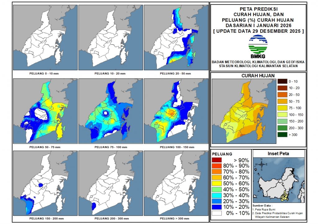 Pada Dasarian I Januari 2026, sebagian wilayah Kalimantan Selatan diprediksi akan mengalami curah hujan antara 75 – 100 mm dengan peluang 30 – 60%, curah hujan antara 50 – 75 mm dengan peluang 30 – 60%, dan curah hujan antara 100 – 150 mm dengan peluang 30 – 80%. Selain itu, terdapat wilayah yang diprediksi 20 – 50 mm dengan peluang 50 – 70% di sebagian kecil Kab. Tanah Bumbu dan Kab. Tanah Laut, serta wilayah yang diprediksi 150 – 200 mm dengan peluang 20 – 40% di sebagian kecil Kab. Tanah Laut.