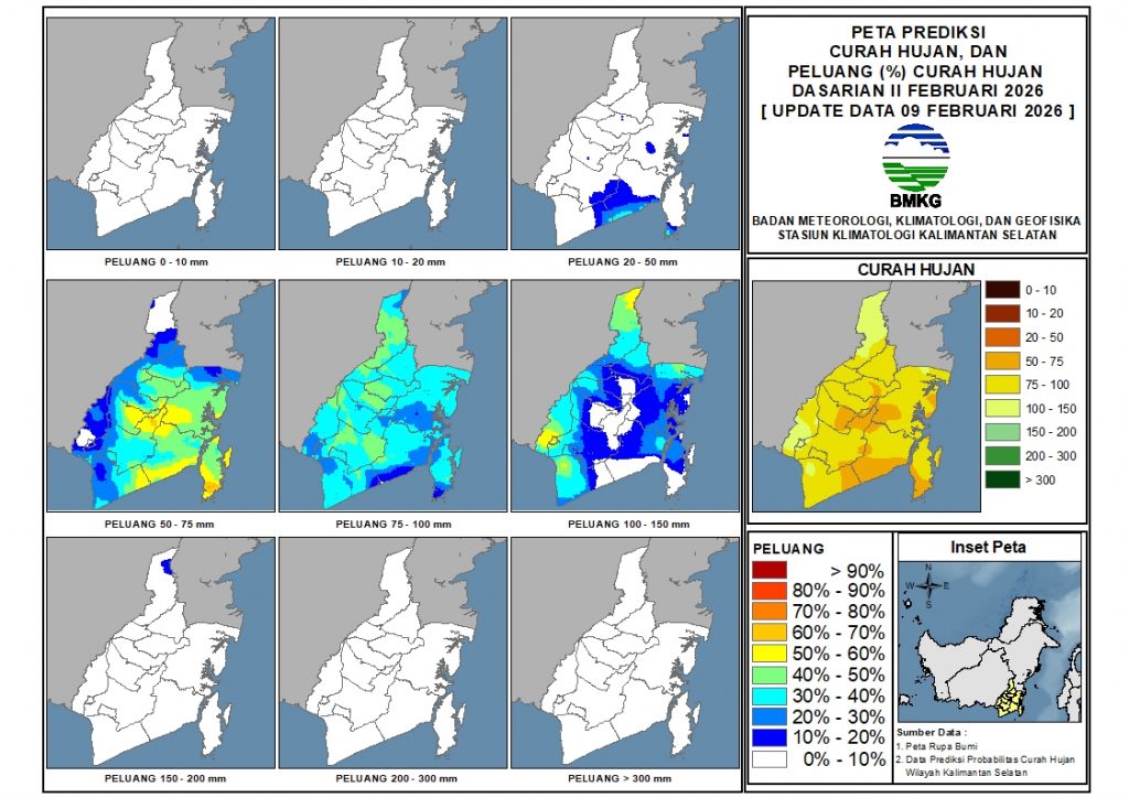 Pada Dasarian II Februari 2026, sebagian besar wilayah Kalimantan Selatan diprediksi akan mengalami curah hujan antara 75 – 100 mm dengan peluang 20 – 50%. Selain itu terdapat juga wilayah yang diprediksi akan mengalami curah hujan antara 50 – 75 mm dengan peluang 40 – 70% dan curah hujan antara 100 – 150 mm dengan peluang 30 – 60% di sebagian besar Kab. Tabalong, sebagian Kab. Barito Kuala, Kota Banjarmasin, sebagian kecil Kab. Banjar, sebagian kecil Kab. Tanah Laut.