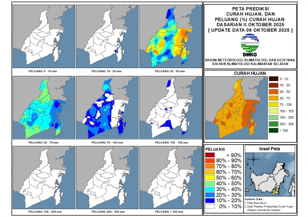 Pada Dasarian II Oktober 2025, secara umum wilayah Kalimantan Selatan diprediksi akan terjadi curah hujan antara 50 – 75 mm dengan peluang 20 – 50% dan curah hujan antara 20 – 50 mm dengan peluang 50 – 80%. Terdapat juga curah hujan antara 75 – 100 mm dengan peluang 20 – 40% di Kab. Tabalong bagian utara, sebagian kecil Kab. Banjar, dan sebagian kecil Kab. Tanah Bumbu.