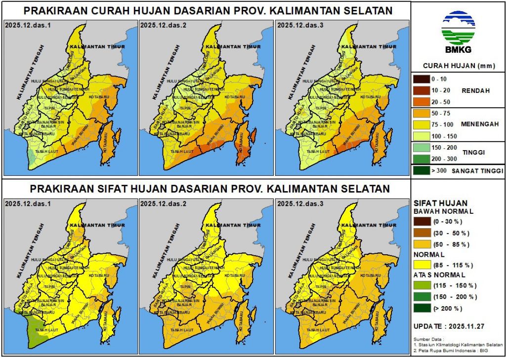 Prakiraan hujan dasarian Kalimantan Selatan pada Desember I s.d. Desember III 2025 (update 27 November 2025)