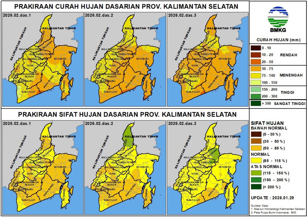 Prakiraan hujan dasarian Kalimantan Selatan pada Februari I s.d. Februari III 2026 (update 29 Januari 2026)