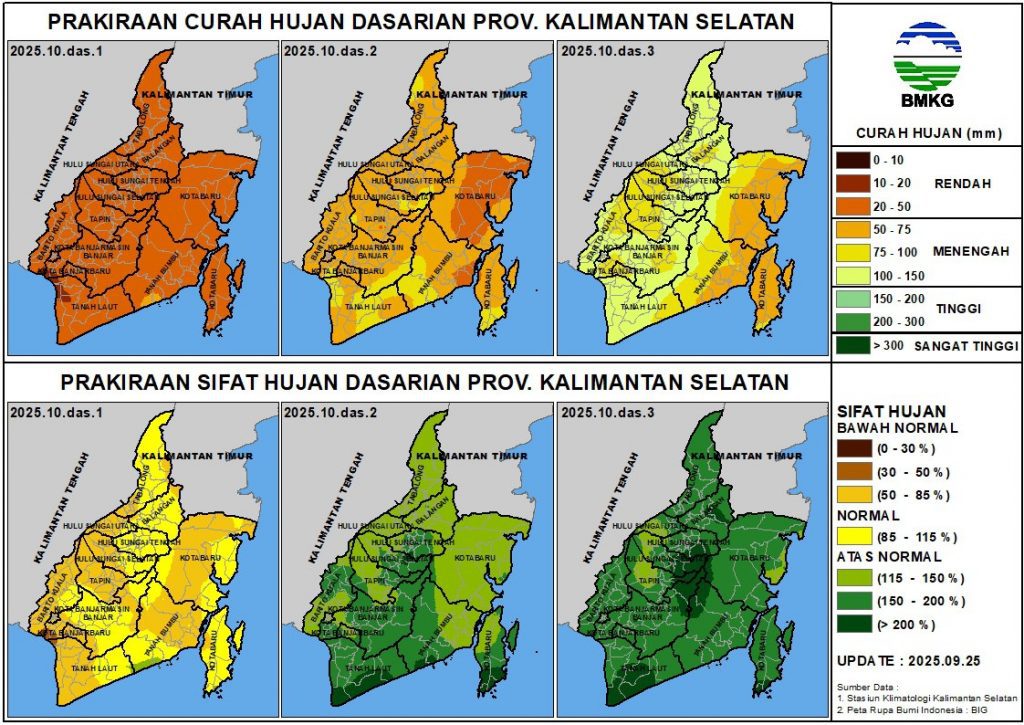 Oktober I (Awal Oktober) 2025, diprediksi sebagian besar wilayah Kalimantan Selatan mengalami hujan kategori Rendah (20–50 mm). Terdapat juga, pada kriteria Menengah (75-100 mm) sebagian kecil di wilayah barat dan selatan (sebagian kecil Kab. Barito Kuala, Kab. Banjar bagian barat, dan sebagian kecil Kab. Tanah Laut), sementara di sebagian kecil Kab. Tanah Bumbu mengalami hujan kategori Menengah (50-75 mm). Sifat hujan umumnya Normal (85–115%), terdapat sebagian wilayah Bawah Normal (50–85%), sebagian kecil Kab. Tanah Bumbu Atas Normal (115–150%).